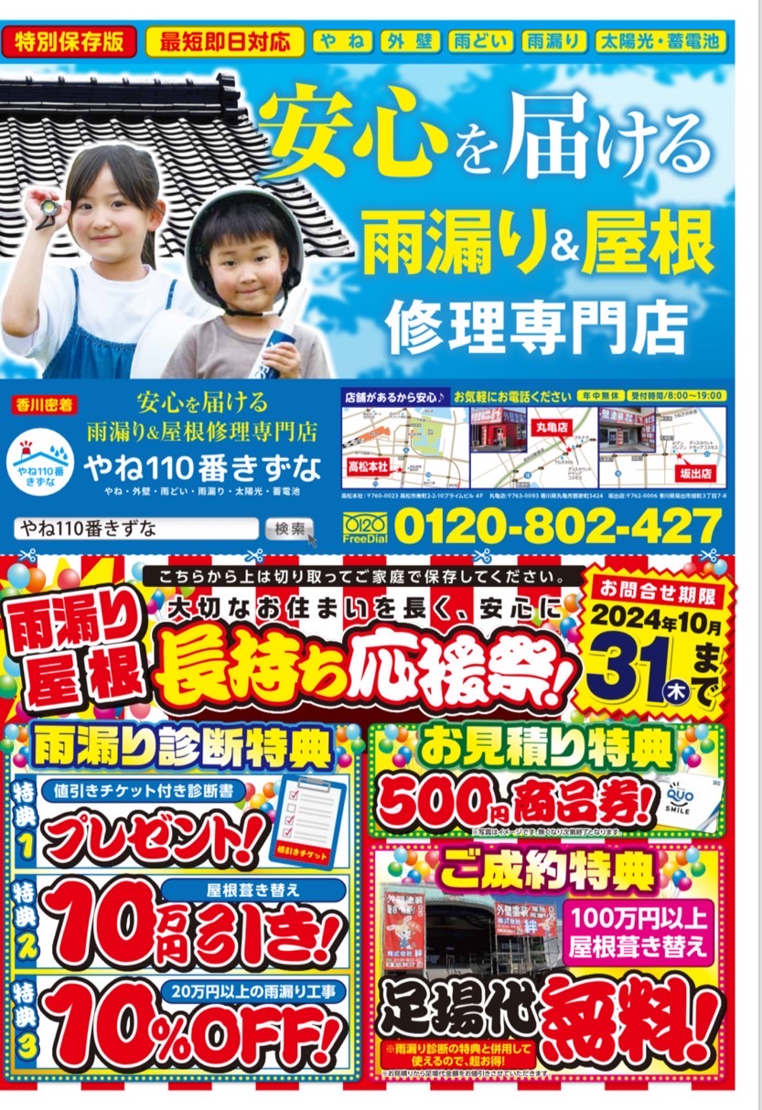 秋はリフォームのシーズンになります。そこで今回やね110番きずなは雨漏り屋根修理長持ちキャンペーンを10月末まで行います。詳しくは今日の新聞折り込みのチラシ新聞を取っていない方はこちらをご覧ください。